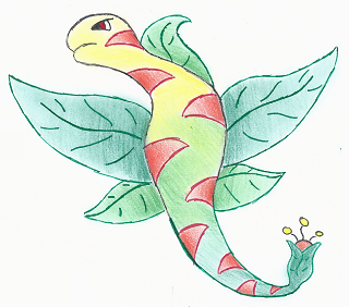 Il tire sa puissance de feu de sa feuille qui capte les rayons de soleil le jour et ceux de la lune la nuit. Bien que son corps soit en grande partie blanc avec des tâches oranges qi s'étalent avec l'âge, le dessus de sa tête reste toujours vert pour se cacher dans les hautes herbes. Son évolution dépend du jour ou de la nuit, à ce moment là il fusionne avec sa feuille. |
