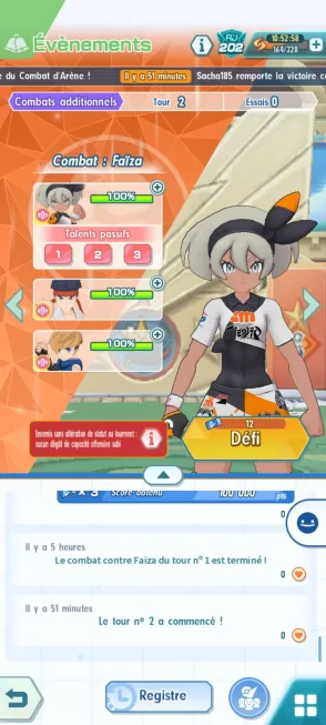 Il est à noter que la progression des combats est partagée entre tous les membres. Si par exemple je commence un combat contre la championne de type Plante mais que je ne le termine pas, quelqu'un d'autre de l'Arène pourra prendre ma place afin de le terminer. Par ailleurs, reprendre un combat commencé par un autre membre de l'Arène vous permet de bénéficier des encouragements de votre prédécesseur et donc de bénéficier de dégâts supplémentaires sur vos capacités. De plus, toutes les altérations, diminutions de stats ou de résilience sont conservées pour le joueur suivant.