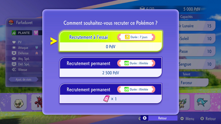 Toutes les 22 heures, 10 Pokémon aléatoires vous sont proposés. Vous pouvez les recruter de manière temporaire gratuitement, ou de manière permanente contre 2.500 Points de Victoire (PdV) ou un Ticket de recrutement. Ces Pokémon ont déjà des EV répartis, même si certaines répartitions laissent à désirer (un Cizayox a été vu avec 32 points en Attaque Spéciale...). Les Pokémon recrutés ont une chance d'avoir un Insigne ou d'être chromatiques, ce qui confirme également la présence de ces éléments dans le jeu.