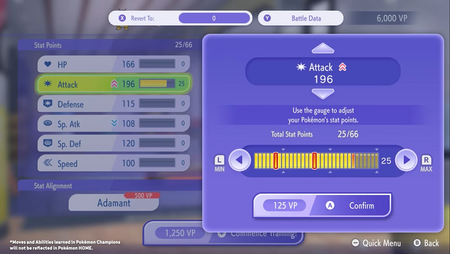 Le plus gros changement est lié aux EV (qui, au passage, s'appellent officiellement points de stats). Au lieu d'un système avec 510 points à répartir avec des gains tous les multiples de 4/8, les EV/PS fonctionnent directement par point de statistique gagné. Plus besoin de division pour connaître le gain en statistiques ! De plus, le fameux reste de 2 EV qui ne donnait aucun point de statistique est converti en un point. Les Pokémon ont donc un point en plus par rapport aux autres jeux, une bonne nouvelle pour les pros de l'optimisation. Le nombre de points investis dans une statistique est également affiché de manière précise, au lieu des vagues graphiques utilisés dans les jeux principaux. Chaque point de statistique coûte 5 PdV, soit 160 pour maximiser une statistique, et 330 pour répartir tous les points d'un Pokémon.