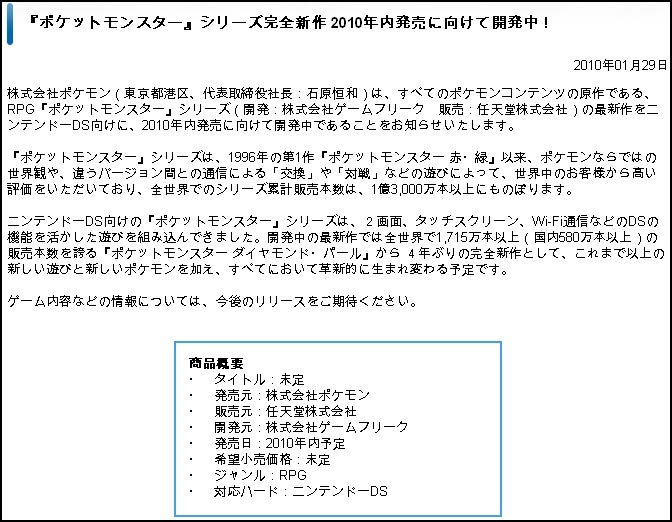 Voici les communiqué de Nintendo révélant l'arrivée d'un nouveau jeu Pokémon et de la 5ème Génération :