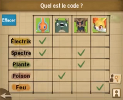 Vous pouvez désormais trouver le code d'accès dans vos Pistes. Il s'agit de déterminer quel Pokémon correspond aux types sur l'écran, ce que vous pouvez trouver dans la bibliothèque !