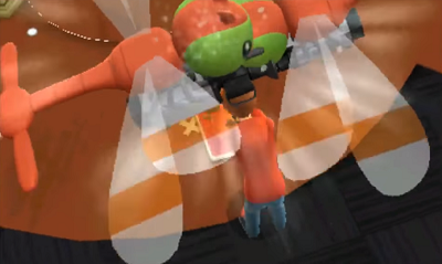 Vous voyez l'ascenseur monter jusqu'au toit, vous le suivez donc. Sur le toit, Keith vous accueille avec son Rapion. Appuyez sur A au bon moment pour éviter son Dard-Venin. Bruyverne vient alors en renfort d Keith et vous envoie une tornade... Appuyez sur A au bon moment pour rattraper Pikachu qui se fait propulser.