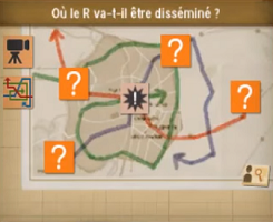 Vous vous rendez compte qu'il ne vous reste que moins d'une heure pour vous rendre sur le lieu. Vous allez sur la Place Centrale et devez trouver le R sous ses 3 formes différentes.