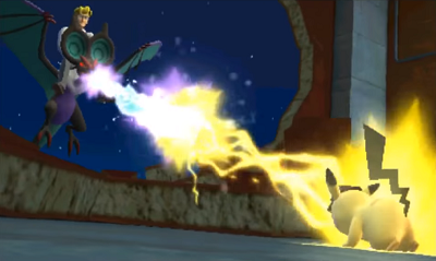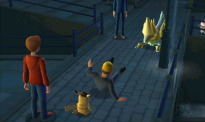 Heureusement, grâce à votre distraction, Pikachu sauve Emilia. Roger s'envole alors avec Bruyverne et envoie une puissante attaque sous influence de R... Pikachu dépasse ses limites et réussit à envoyer un Tonnerre ! Appuyez rapidement sur A pour contrer Bruyverne. Ce dernier effort fait, vous avez fait tomber le dernier rempart à cette affaire : Roger est arrêté.
