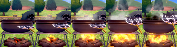 Vous devrez par la suite touiller le Curry pour bien mélanger les différents ingrédients ! Aller trop lentement brûlera le fond de la casserole, tandis qu'aller trop rapidement fera déborder la sauce. Une bonne vitesse se situe à environ 2 tours de marmite par seconde.Vous pourrez également vérifier votre vitesse par un aspect visuel aisément identifiable : des étoiles et de la fumée blanche apparaîtront !