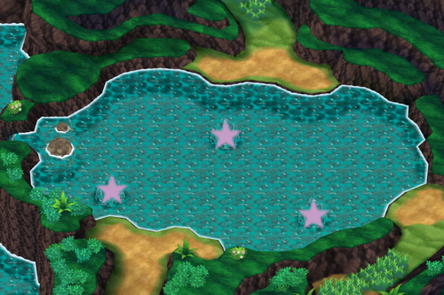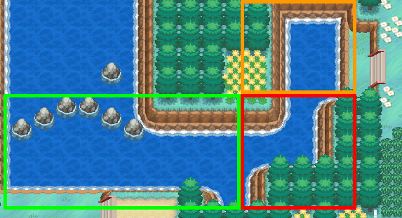 Zone peu recommandable (rouge) : Une petite zone qui sert de croisement entre la partie verticale et la partie horizontale de la zone d'eau de la Route 1 ! Cette zone fait apparaître très peu d'eau autour, et est donc la zone où il y a peu de chance qu'une bulle d'eau apparaisse de manière relativement rapide !