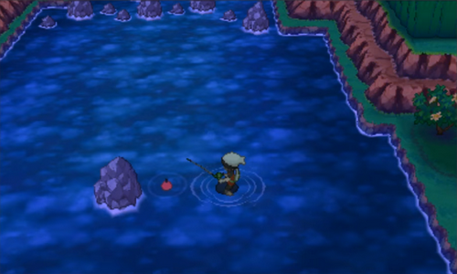 Comme vous pourrez le constater, tous les spots de pêche de ce lac ont des remous et sont 3 au total ! Un spot de pêche à remous s'usant si vous relevez trop tôt, trop tard ou pêchez un objet, cette zone est idéale si jamais vous ne pêchez pas un Pokémon étant donné qu'il faut quitter la zone pour faire revenir les remous, ce qui est loin d'être idéal pour Barpau. La meilleure technique est la suivante :