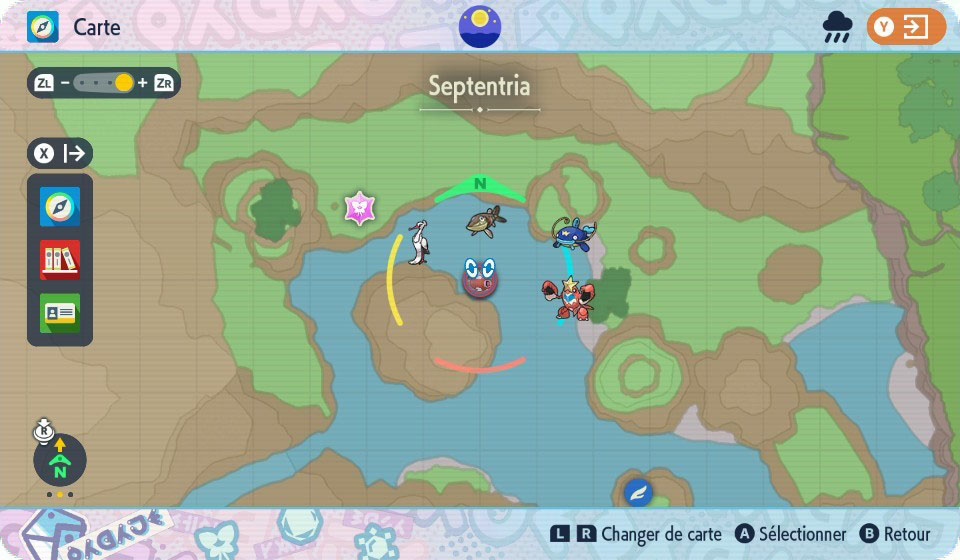 | Reset | 5 lieux possibles Caverne Pugnacité Lagune CirculairePar temps Clair, Ensoleillé et par Tempête de Sable Lande BoldairPar temps Clair, Nuageux, Ensoleillé et par Tempête de Sable Plage de l'ÉpreuveSauf par temps Pluvieux et Brumeux Plaine SalutationPar temps Ensoleillé seulement | 100% | |