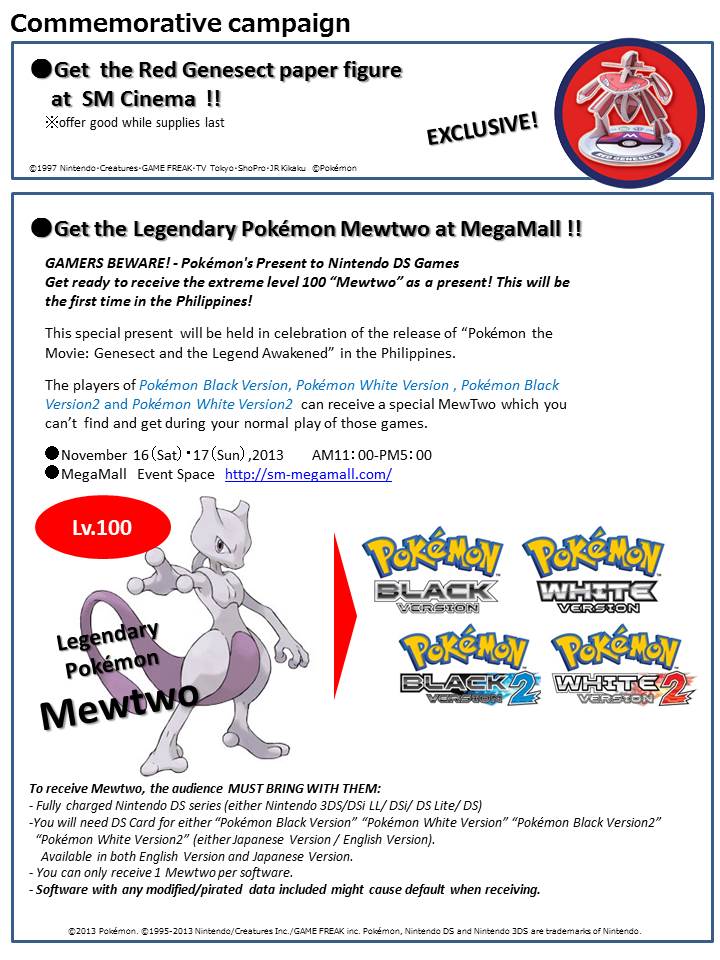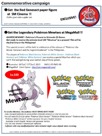 Deux Pokémon furent distribués à l'occasion de la sortie du 16ème film Pokémon : Genesect et l'éveil de la légende.