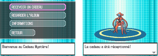 Le cadeau mystère peut être débloqué en répondant à la question de la boutique Pokémon. Le joueur doit inscrire « Connexion avec les dresseur » (le mot « dresseur » n'est pas présent au pluriel) pour voir apparaître l'option Cadeau myst. sur son menu de démarrage.Cette fois-ci, le cadeau mystère n'apparaît que par connexion sans fil.