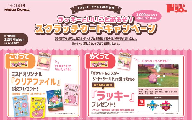 Suite à une nouvelle collaboration avec la chaîne Mr. Donut au Japon, à partir du 4 décembre 2020 et jusqu'au 5 février 2021, les achats de plus de 1000¥ permettaient aux joueurs d'obtenir une carte à gratter contenant un code permettant la réception d'un Leveinard spécial sur Pokémon Épée et Bouclier.