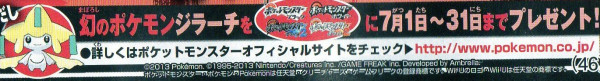 Ce Jirachi a été distribué du 1er juillet au 31 juillet 2013 en Wi-Fi, ainsi que par le biais des bornes Nintendo Zone.