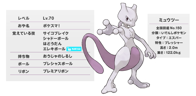 Ce Mewtwo a été distribué du 26 septembre au 31 octobre 2011 en Wi-Fi, à l'occasion du premier anniversaire de la sortie de Pokémon Noir et Blanc au Japon.