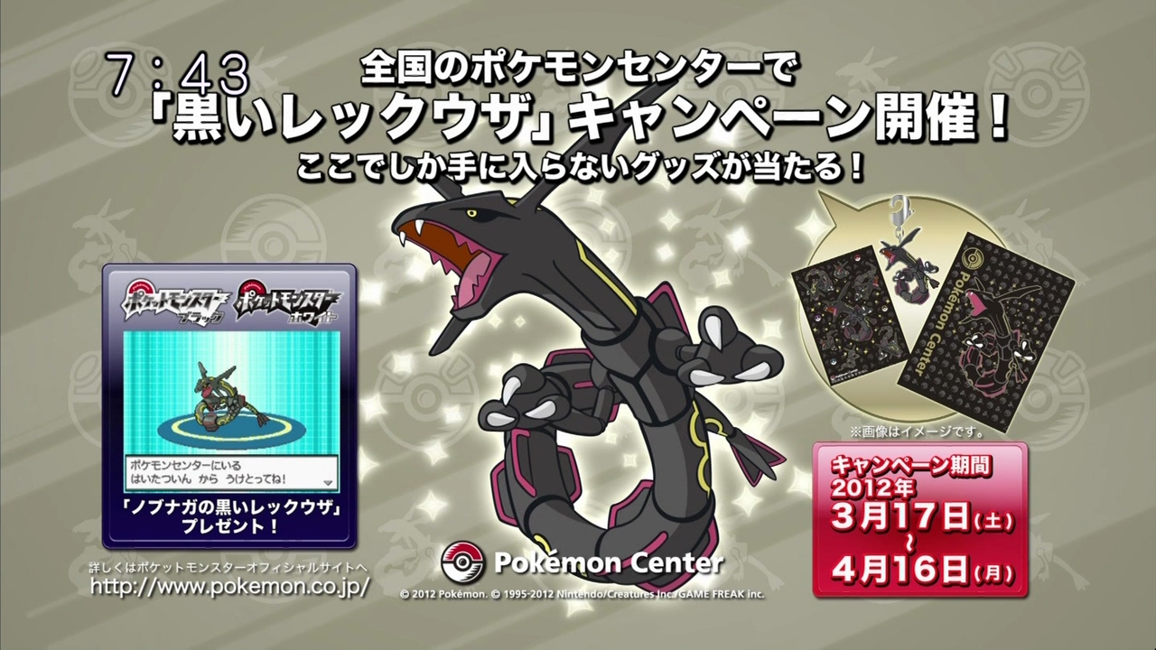 Ce Rayquaza ★ (dit "Black Rayquaza") a été distribué du 17 mars au 16 avril 2012 en Wi-Fi, pour promouvoir la sortie du jeu Pokémon Conquest.