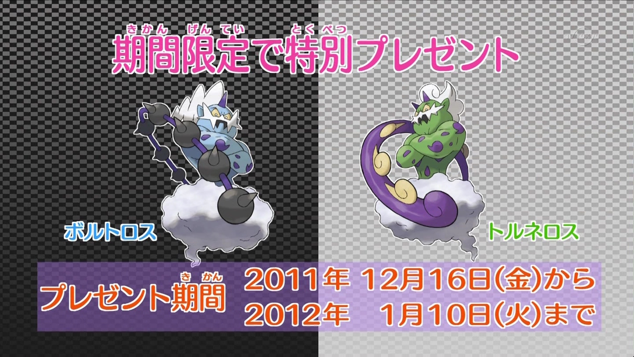 À l'occasion de leur apparition dans la série animée sur l'île de Milos, Boréas et Fulguris furent distribués en Wi-Fi du 16 décembre 2011 au 10 janvier 2012, afin de permettre la capture de Démétéros.