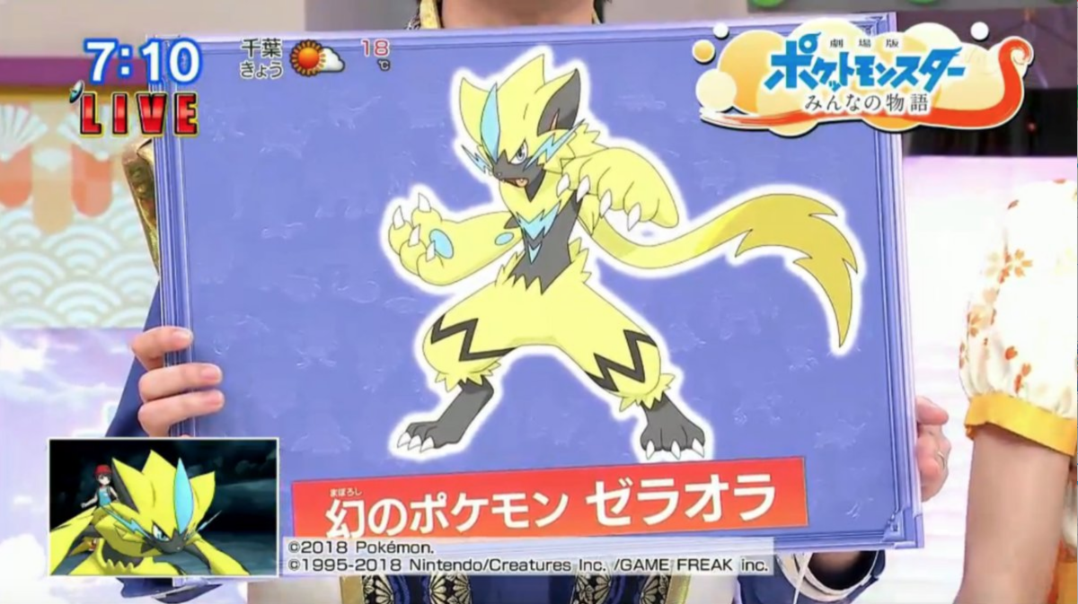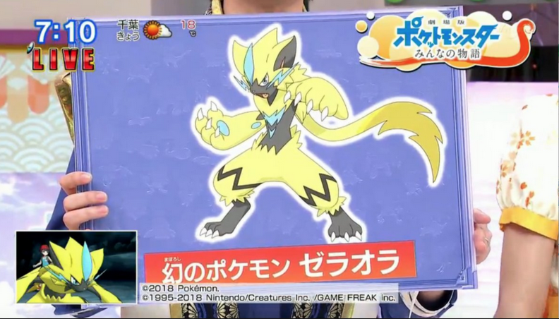 Ce Zeraora a été distribué dans les cinémas au Japon via le sans-fil local lors de la diffusion du 21ème film Pokémon : L'histoire universelle du 13 juillet au 30 septembre 2018. Il sera également distribué lors de deux avant-première le 1er juillet 2018.