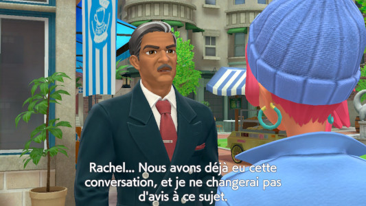 Elle arrive avec un peu de retard, vous captez des bribes de sa dispute avec son père, le Maire. Rachel est contre son projet municipal dont le but est de gérer les Pokémon pour éviter qu'ils soient dangereux avec les humains comme lors de l'affaire du R. Elle trouve que son père a tort, car cela met le problème sur les Pokémon alors que c'est souvent la faute des humains.