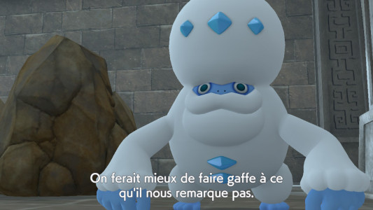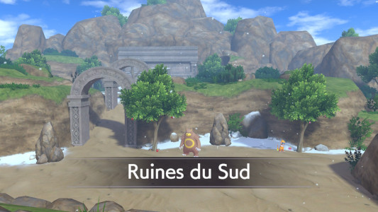 Vous arrivez aux Ruines du Sud sous la neige et il fait bien froid, ce qui n'est pas normal pour la saison. Vous suivez le chemin principal jusqu'aux ruines. Sur le trajet, vous pouvez activer quelques Affaires Locales (Manternel, Ursaring et Docteure Quiz).