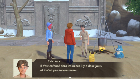 En haut du chemin, vous arrivez devant l'entrée des ruines. Vous trouverez Chris Honor, l'assistant du professeur Gordon, et son fidèle Goinfrex. Pendant qu'il prépare un délicieux curry bien épicé, vous lui posez quelques questions. Vous apprenez que le professeur est coincé dans les ruines depuis 2 jours et que son partenaire est Ramoloss.