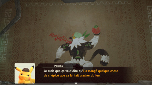 Pikachu persuade Chimpenfeu de faire fondre la glace et vous pouvez à présent examiner la fresque centrale. Regardez la baie qui est une Baie Rouge et la tête de Quartermac qui indique qu'il a mangé un truc épicé.