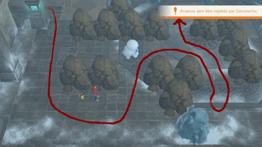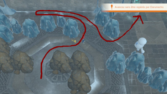 Cette fois, c'est un Darumacho de Galar vénère qui bloque votre passage. Il va falloir être discret et traverser la salle sans se faire voir.