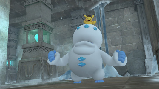 Vous arrivez au premier sous-sol des ruines : comme à l'extérieur, le froid y est bien présent. Sur la droite, le chemin finit en cul-de-sac bloqué par un mur de glace.Allez à gauche pour trouver le Ramoloss de Gordon coincé dans un bloc de glace. Vous appelez Rachel pour qu'elle vous aide à extraire Ramoloss de ce bloc. Pikachu récupère un morceau de sa queue qui s'est détaché dans l'action
