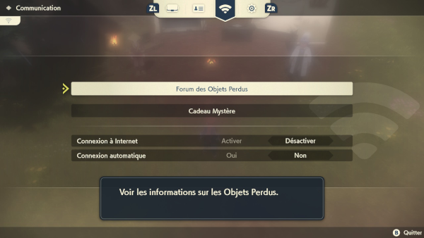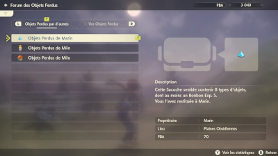 Une fois la Sacoche ramassée, rendez-vous dans la section Communication du menu principal (flèche haut de la croix directionnelle) et sélectionnez le sous-menu Forum des Objets Perdus. Les requêtes marquées par un point d'exclamation jaune désignent celles que vous avez complétées. Validez-les avec A pour obtenir vos PBA !