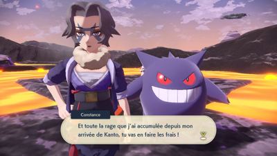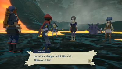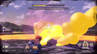 Il est temps d'aller calmer le Pokémon Monarque. Nacchara vous donne quelques conseils : pensez à bien éviter ses grosses attaques ! Arcanin de Hisui apparaît alors pour vous défier !