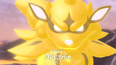 Il regarde vers le ciel avant de sauter jusqu'au centre de l'arène. Selon la situation, cela peut créer un cercle de flammes au centre, ce qui vous complique le mouvement... Éloignez-vous le plus possible du centre et/ou esquivez avant l'impact au sol. Vous pouvez déclencher un combat en annulant la charge d'Arcanin en le touchant avec 5 boules pacifiantes.