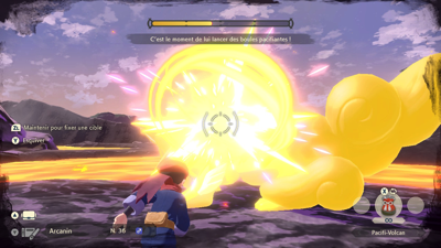 Pour en venir à bout, vous allez devoir réduire sa jauge de frénésie à zéro. Cette jauge baissera chaque fois que vous parviendrez à toucher le Pokémon avec une boule pacifiante. Une fois vulnérable, vous pouvez alors envoyer l'un de vos Pokémon pour le combattre.