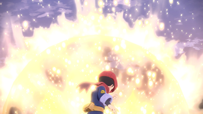 Une fois sa jauge totalement réduite et la dernière boule pacifiante lancée, la lumière dorée qui émanait de ce dernier n'est plus ! Il revient alors à la raison et vous remet la Plaque Flamme pour vous remercier de l'avoir calmé.
