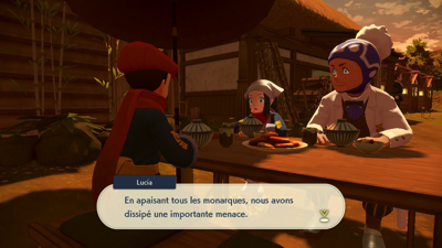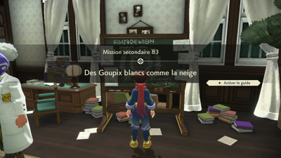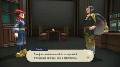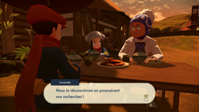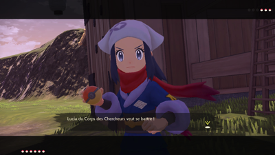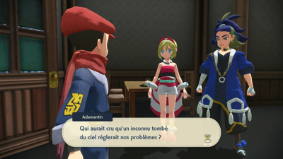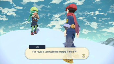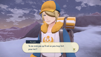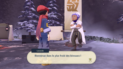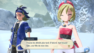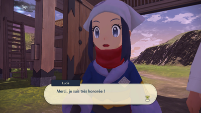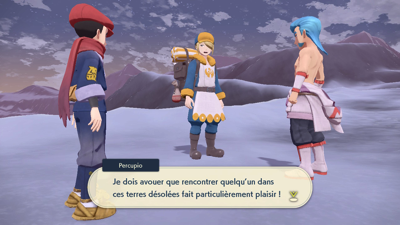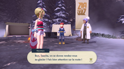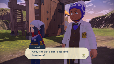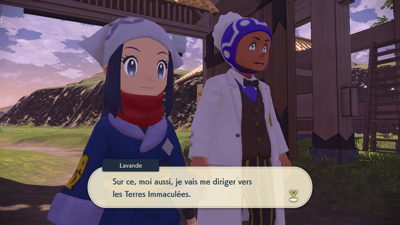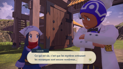 Dirigez-vous ensuite jusqu'à la porte du village pour retrouver Aurel/Lucia et le Professeur. Ce dernier se demande si c'est réellement une bonne idée d'aller dans les Terres Immaculées car en plus d'être un coin dangereux, le Pokémon Monarque ne semble pas avoir fait de dégâts.