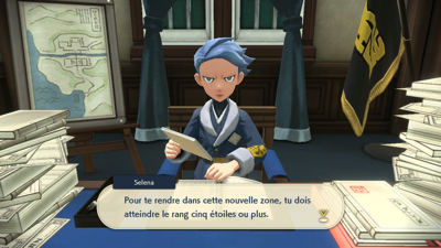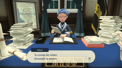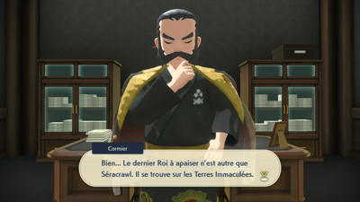 Au Siège Galaxie, étant donné que vous avez déjà apaisé 4 Monarques et que vous avez désormais gagné la confiance des deux chefs de Clan, votre nouvelle mission consistera à vous rendre dans les Terres Immaculées pour y apaiser le dernier Pokémon Monarque qui n'est autre que Séracrawl.