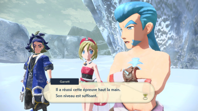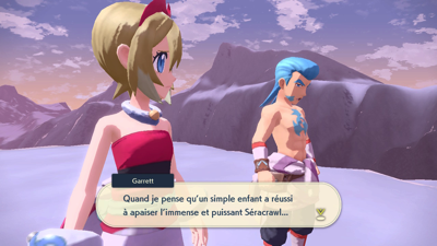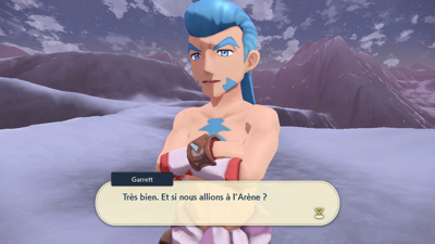 Garrett vous rejoint au sommet : vous lui remettez l'objet. Il vous attend à l'Arène de l'Iceberg pour soigner vos Pokémon et vous préparer à l'affrontement avec Séracrawl.