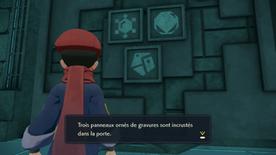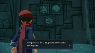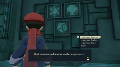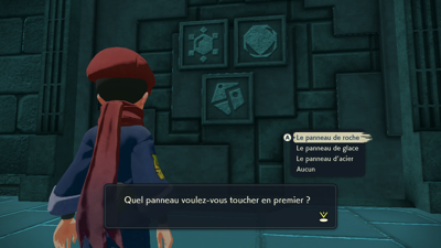 Enfin, une dernière énigme se trouvera devant vous : touchez le panneau acier, glace, roche, glace, acier puis roche pour résoudre l'énigme et débloquer le passage.