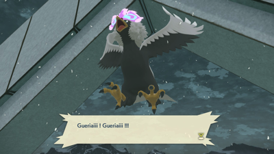 Atteignez un point situé en hauteur, puis planez grâce à la Monture Gueriaigle. Appuyez sur le bouton + à tout moment, ou sur le bouton A lorsque vous êtes en pleine chute pour appeler Gueriaigle.