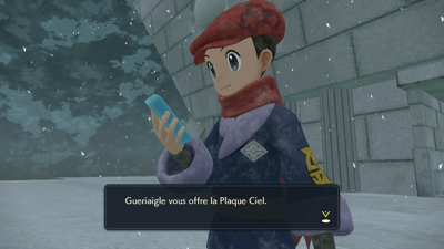 Sabi vous propose ensuite de jouer de la flûte avec elle. Cela aura pour effet de faire mémoriser la mélodie à Gueriaigle de Hisui, qui deviendra votre nouvelle Pokémonture. Il vous remet la Plaque Ciel et vous êtes rejoints par Adamantin.