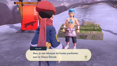 Il est temps d'aller calmer le Pokémon Monarque. Là-bas, vous retrouvez Garrett accompagné de Percupio qui lui a apporté des Fortichampis, nécessaires à la fabrication des boules pacifiantes !