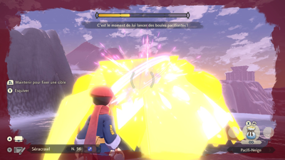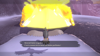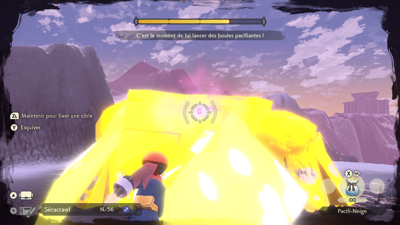 Pour en venir à bout, vous allez devoir réduire sa jauge de frénésie à zéro. Cette jauge baissera chaque fois que vous parviendrez à toucher le Pokémon avec une boule pacifiante. Une fois vulnérable, vous pouvez alors envoyer l'un de vos Pokémon pour le combattre.