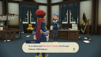 Au rez-de-chaussée, Selena semble être aux prises avec un Chenipotte... que son Abra neutralise aussitôt. Elle vous rappelle que vous devriez être un Membre 5 Étoiles du Groupe Galaxie (en effectuant des tâches Pokédex), car les Pokémon que vous rencontrerez dans les Terres Immaculées sont bien plus puissants que ceux des Plaines Obsidiennes, du Marais Carmin, de la Côte Lazuli ou du Contrefort Couronné.