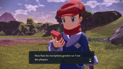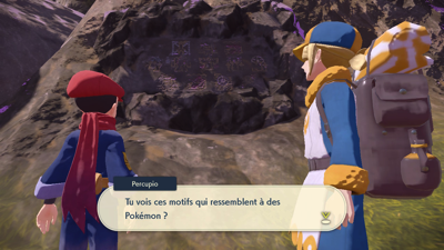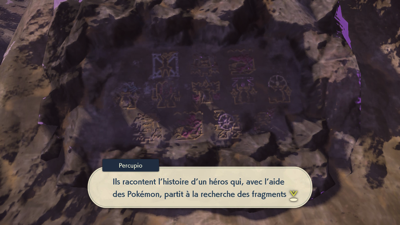 De retour au Bivouac du Plateau, dirigez-vous vers Percupio. Il se met à déchiffrer devant vous le message gravé dans la roche : c'est l'histoire d'un héros qui, avec l'aide des Pokémon, partit à la recherche des fragments d'une divinité toute puissante qui appartiendraient à Arceus !