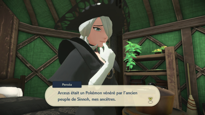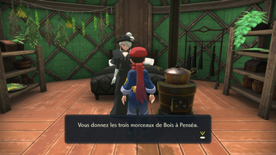 De retour sur les lieux, entrez dans la maison et discutez avec Penséa : cette dernière commence par vous féliciter pour vos exploits au sommet du Mont Couronné et n'a malheureusement rien de plus à vous apprendre sur Arceus que ce que Percupio vous a déjà dévoilé...