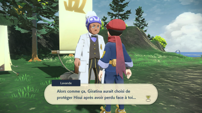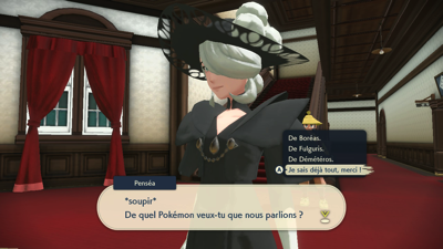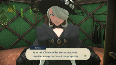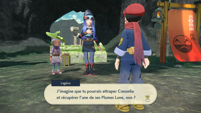Cependant, elle vous proposera de vous donner des renseignements sur d'autres Pokémon présents à Hisui et qui pouraient peut-être vous aider à avancer dans votre quête.