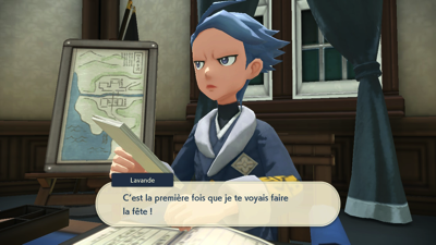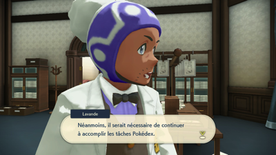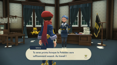 Après vous avoir demandé si vous vous êtes bien amusé à la fête, Selena et le Professeur vous parlent de l'avancement de votre Pokédex.