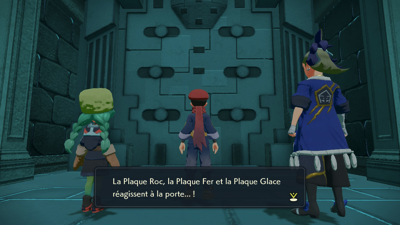 De là, Adamantin et Sabi vous rejoindront et le chef du Clan Diamant vous expliquera qu'un Pokémon colosse se trouve derrière cette porte : examinez-la pour que vos Plaques Roc, Fer et Glace réagissent et finissent par déverrouiller l'accès.