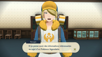À ce même moment, Percupio débarque et vous explique qu'il pourrait justement avoir des informations intéressantes au sujet d'un Pokémon légendaire.