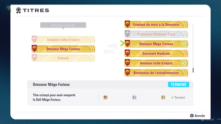 Terminer le Défi Méga-Furieux vous offre le titre Dresseur Méga-Furieux/Dresseuse Méga-Furieuse, et votre meilleur temps sera enregistré. En dehors de cela... aucune autre récompense, à part la satisfaction d'avoir triomphé !