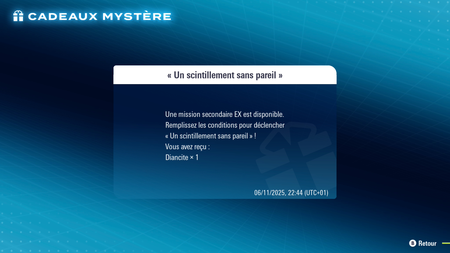 Pour pouvoir rencontrer Diancie, vous devez d'abord télécharger le Cadeau Mystère nommé Un scintillement sans pareil. Pour cela, allez dans le menu Jeu en ligne, puis dans Cadeau Mystère et enfin Via Internet. Notez que cela nécessite d'être connecté à Internet, mais pas d'avoir un abonnement Nintendo Switch Online actif. Vous recevez la Diancite, ce qui active l'apparition de la mission secondaire.