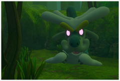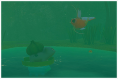 Nénupiot | Les Nénupiot se trouvent principalement dans la clairière ensoleillée où vous pouvez les voir de près : au début de cette zone, lancez une pomme sur le premier Nénupiot pour qu'il regagne l'eau puis jouez une mélodie et les Nénupiot se mettront à danser ! Après cela, ils plongeront pour former une tour en s'empilant les uns sur les autres : lancez un orbe sur celui du dessus et il commencera à danser ! Un autre Nénupiot se trouve dans la zone finale dans son petit lac : il est possible d'attirer Bulbizarre pour qu'il chevauche ce Nénupiot si vous lancez un orbe sur Bulbizarre, puis sur Nénupiot ! |